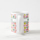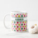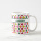 Essa caneca festiva e divertida apresenta um padrão de círculos e faixas verticais em verde-vermelho, verde limão, laranja, rosa e escuro sobre fundo branco. Esta caneca retrô está pronta para ser personalizada com um nome em letras verdes escuras. O padrão envolve a caneca e o nome aparece em ambos os lados da caneca.