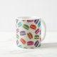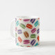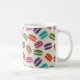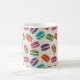 Estes doces doces à base de merengue franceses estão cheios de um centro saboroso para criar um delicioso sanduíche de biscoitos. Este arco-íris empilhado de cores significa diferentes gostos! Tem uma impressão esticada e branca e esticada no fundo.