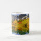 Uma caneca com uma bela fotografia do país. Montanhas de pedra com uma floresta de outono em cores brilhantes. Um lago tranquilo reflete as montanhas, árvores e gramíneas.