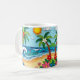 A coastal Coffee Mug in a paper quilling style ai illustration of two palm trees, the sun, ocean waves, a beach and tropical flowers.