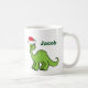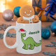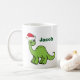 Fantástico dinossauro verde que parece adorável num chapéu vermelho de Papai Noel, de férias, com um sorriso. Gosto de animais pré-históricos de Natal e presentes que as crianças vão amar. Personalize a caneca desta criança em verde com o nome da criança para torná-la ainda mais personalizada.