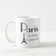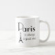 Uma caneca fofa com uma imagem da Torre Eiffel em branco com as palavras "Paris é sempre uma boa ideia" em ambos os lados. O fundo é branco, mas você pode personalizá-lo para qualquer cor que desejar.