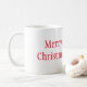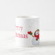 A caneca de café cerâmica é mostrada com um impressão de arte de boneco de neve de Natal festivo, com o texto Feliz Natal. Personalize este item ou comprar como está.