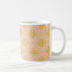 Hexagonal floral pattern with blue-green centers and orange outlines on a peach background. White lines connect the shapes, creating a geometric grid.
