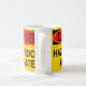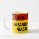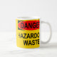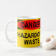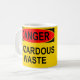 Um olhar engraçado para o café do escritório. Fundo amarelo brilhante com a palavra Perigo no topo num oval vermelho. Resíduos perigosos no fundo a preto.