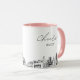 Caneca de café de casamento de Omaha. O design exibe um esboço deslumbrante da linha do horizonte com a capacidade de personalizar com seu nome ou os nomes das damas de honra, convidados ou outros. Atualize facilmente o tamanho e a cor da caneca ao seu gosto.