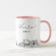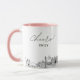 Caneca de café de casamento em Virginia Beach. O design exibe um esboço deslumbrante da linha do horizonte com a capacidade de personalizar com seu nome ou os nomes das damas de honra, convidados ou outros. Atualize facilmente o tamanho e a cor da caneca ao seu gosto.