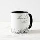 Caneca de café com a moderna silhueta de Baltimore como presente de casamento com a inscrição "obrigado". O design apresenta um esboço impressionante com a capacidade de personalizar seus nomes e localização exata. Entre no ferramenta de design da Zazzle para personalizações adicionais.