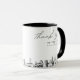 Caneca de café com a silhueta de Austin como lembrança com o texto "obrigado". O design apresenta um esboço deslumbrante com a capacidade de personalizar seus nomes e localização exata. Entre no ferramenta de design da Zazzle para personalizações adicionais.