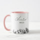 Caneca de café para casamento em Raleigh. O design exibe um esboço deslumbrante da linha do horizonte com a capacidade de personalizar com seu nome ou os nomes das damas de honra, convidados ou outros. Atualize facilmente o tamanho e a cor da caneca ao seu gosto.