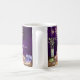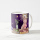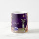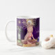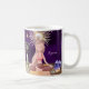 Esta bela design de caneca de café mostra uma menina meditando em um tapete de ioga cercado por cristais, velas e bambu sortudo em uma bela sala com uma parede roxa profunda e chão azulejo e trabalho de arte ouro. Personalize com um nome!