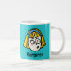 Esta caneca de café personaliza seu nome com um rosto de desenho animado no fundo verde azul.