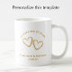 Add the couple's names to this stylish golden 20th wedding anniversary mug. The tan simple, modern script is not real foil but faux gold. All the elegant typography is editable. Personalize this trendy keepsake coffee mug with the couples names and wedding anniversary date for a beautiful wedding anniversary gift. "Celebrating 20 Years" can be customized to any number for a 60th, 50th, 25th or any anniversary year. I created these hand drawn hearts for your keepsake 20th wedding anniversary gift. The two unique copper golden hearts created with impressions of leaves and buds, add a romantic botanical touch. The anniversary party table would look great with these commemorative glasses and my matching heart napkins and coasters. Explore my collection for matching etched wine glasses, napkins and coasters for easy, yet stylish and unique custom party decorations.
