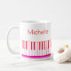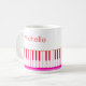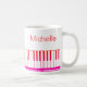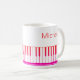 Mug moderno e na moda com teclado de piano e notas de música em preto e branco personalizado com seu nome em um roteiro manuscrito. Ideal para professores de música, músicos e profissionais de música. ALTERAÇÕES: Você pode alterar a cor branca do plano de fundo ou o estilo, cor, tamanho e posicionamento da fonte de texto clicando em EDIT para obter uma aparência personalizada ou simplesmente excluir o nome da amostra para deixar esse vazio de área. OPÇÕES: A amostra é mostrada na caneca tamanho 11 oz; outros tamanhos e estilos de hardware estão disponíveis na página de pedidos