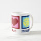Um presente de caneca Pickleball de Paz para um jogador de piquetes com um sinal de paz bonito, coração, e uma bola amarela para o esporte.