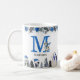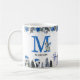 Uma caneca de natal azul, bonita, com flores e folhagem elegantes de Natal, adoráveis pinguins de bebê, bonitão, presentes, sua inicial e nome.
