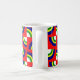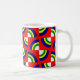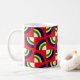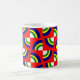 Esta caneca tem um design de Bauhaus com quatro círculos em azul, amarelo, verde e branco num campo de vermelho.