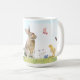 A caneca de Páscoa mais bonita com um coelho marrom peludo com um inseto de senhora na cabeça, pintinho bebê, croco roxo, flores de trevo e borboletas todas em um prado, prado Primavera com céu azul. Personalize com seu nome ou saudação.