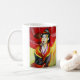com design de arte original de pintura aquosa de Geisha Japonês em quimono com guarda-chuva vermelha e fundo amarelo. Brilhante e colorida, inspirada pela arte oriental e asiática, esta bela senhora vem da região de Kyoto do Japão.
