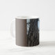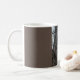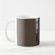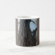 Uma caneca com uma foto de um esquilo em uma árvore nela, com um fundo castanho.