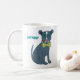 Esta caneca de café personalizada apresenta uma ilustração de um belo filhote. Este cão apper está vestindo um par de óculos coloridos e uma gravata de arco verde limão. Ao lado do gráfico de cachorrinho do pit bull é um ponto para adicionar um nome em letras de cores coordenadas.