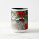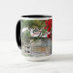 Esta caneca de café tem uma foto que eu tirei de uma antiga cabana de pesca de lata apodrecida, abandonada no mangue e coberta por belas flores vermelhas de Pohutukawa.