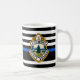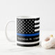 Thin Blue Line Police Department Coffee Mug - Bandeira Americana em cores da Polícia, design azul e preto moderno. Personalize com o logotipo do seu departamento e personalize com o nome dos policiais. Esta caneca de polícia personalizada é perfeita para departamentos de polícia e polícias. COPYRIGHT © 2020 Judy Burrows, Black Dog Art - Todos Os Direitos Reservados. Departamento de Polícia Logotipo Personalizado Polícia Café Mug