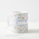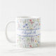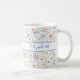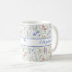 Linda caneca inspirada em boho, apresentando alegres flores silvestres em aquarela em tons de rosa, lavanda, amarelo, azul e verde. Personalize-a em azul com seu nome ou o nome de alguém querido para o presente perfeito!