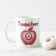 Um design moderno de professor com uma maçã vermelha em camadas com detalhes de anéis concêntricos e um título de Professor em negrito em tipografia vermelha. A composição centralizada cria uma aparência calma e equilibrada que se destaca em uma caneca branca. Um presente atencioso para educadores, novos graduados ou qualquer pessoa orgulhosa da profissão de professor