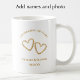 Adicione os nomes do casal e foto a esta caneca única dourada de 50º aniversário de casamento. O tom dourado simples e moderno não é de uma folha de ouro real, mas de um efeito dourado. Toda a tipografia elegante é editável. Personalize esta caneca de café com foto especial com os nomes do casal e data de aniversário de casamento para um presente de aniversário de casamento lindo. "Celebrando 50 Anos" pode ser personalizado para qualquer número para um aniversário de 60, 40, 25 anos ou qualquer outro ano. Eu criei estes corações desenhados à mão para o seu presente de aniversário de casamento de 50 anos. Os dois corações dourados cobres únicos criados com impressões de folhas e botões, adicionam um toque botânico romântico. Isso seria uma ótima lembrança para uma festa de 50º aniversário dourada. A mesa ficaria linda com essas xícaras comemorativas e minhas guard