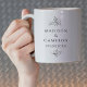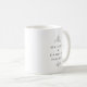 O design elegante da caneca de café de casamento em preto e branco apresenta os nomes do casal e a data do evento em uma bela fonte serifada clássica em preto sofisticado sobre um fundo branco crocante. A composição tradicional fresca é adornada com folhas botânicas decorativas. O design se repete para que seja visível quando segurado em qualquer das mãos. Todas as cores deste design podem ser personalizadas. Envie um e-mail para invitationsuites@gmail.com com perguntas ou solicitações de cores personalizadas.