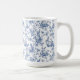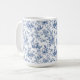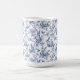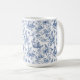 Uma charmosa caneca de café com Primavera apresenta um padrão de Chinoiserie Toile de Jouy azul e branco com coelhos, borboletas e primavera.