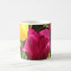 Uma bela variedade de tulipas de primavera na Fazenda das Tulipas de Wooden Shoe em Woodburn, Oregon. Uma vista de perto de uma bonito tulipa rosa-púrpura com outras tulipas coloridas que a rodeiam. Foto: abril de 2018.