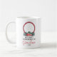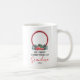 Uma caneca de café personalizada de natal com uma foto do seu neto com duas tonalidades de borda vermelha, árvores de Natal de aquarela, um caminhão de coleta vermelho, e o ditado bonito "meu primeiro natal como avó", e o ano.