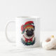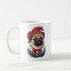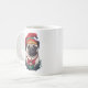 A "Caneca de Natal" ostenta uma cena alegre de um bonitinho fazendo um chapéu de Papai Noel em meio a uma paisagem nevada. Cores vibrantes de férias e uma expressão alarmante fazem um brinde.