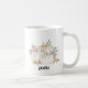 Uma caneca com abóboras brancas de rico aquoso com acentos de brilho sujo de ouro. Cercados por folhas verdes e flores rosas selvagens.