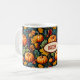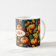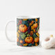 Grandes e pequenas abóboras, folhas verdes e douradas, e uvas roxas exuberantes se combinam para fazer um belo tema de Ação de Graças nesta caneca. Linda imagem de colheita para sua casa!