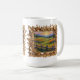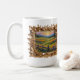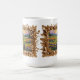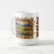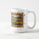 Esta caneca de café tem um quadro de ouro que contém uma pintura de paisagem.
