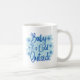 Uma caneca de café azul de inverno com flocos de neve que tem o bebê que está frio lá fora.