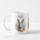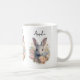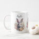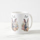 A mug with a sweet and adorable watercolor image. A bunny rabbit with white and gray fur. A garland of carnation flowers in pastel colors of pink and peach. A cute Easter, birthday or baby shower image for bunny rabbit lovers.