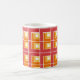 Essa caneca tem um design geométrico de L's em vermelho, laranja e amarelo, colocado em diferentes direções num campo de branco.