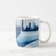Uma paisagem urbana azul e sombria refletida em terreno montanhoso selvagem.