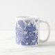 This ceramic mug wraps the timeless Blue Willow motifs—willow trees, a three-arched bridge, pagoda, flying birds, and a boat—into a panoramic scene where genteel figures in Regency attire shamble as zombies. The cobalt blue on white porcelain evokes authentic transferware, with ghoulish details like tattered gowns and lurching poses adding macabre humor to the pastoral landscape.