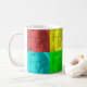 Retrato de Beethoven em quadrados vermelhos, amarelos, azuis e verdes. Imagem com efeito gravado aplicada ao design. Canecas de café personalizadas.