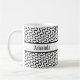 A superfície desta caneca é coberta por um padrão preto e branco retrô com linhas de ondas diagonais. Através do centro há uma banda branca bordada a preto. Foi adicionado um primeiro nome sobre esta banda a ambos os lados da caneca. Você pode adicionar seu nome onde os espaços reservados aparecem, escrever outra coisa ou remover as palavras completamente. A fonte também pode ser alterada para outra, se quiser! É excelente brincar com este design e fazer dele seu. Personalizar e editar é divertido!