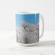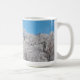 Uma queda de neve leve deixou uma camada branca em uma colina de árvores. O céu azul acrescenta um contraste distinto à cena.