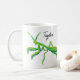 Esta caneca de café apresenta a minha ilustração pintada de uma mantis de oração em verde-claro com sotaques laranja e o seu nome ou outro texto em letras de escrita pretas. O inseto gráfico e o nome aparecem em ambos os lados da caneca.