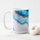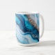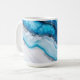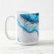 Ondas de azul vibrante e aqua fluem através da imagem, intercaladas com sotaques dourados brilhantes. As cores giram e se misturam, dando um sentido de movimento e elegância.