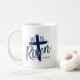 Coffee mug is shown in navy and white with a He Is Risen print.