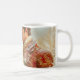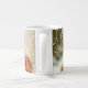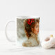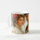 Feriado de Natal, Romance Mug - as cores são vermelho, creme, preto e branco. O casal vitoriano compartilha um momento romântico numa rua Dickensiana.